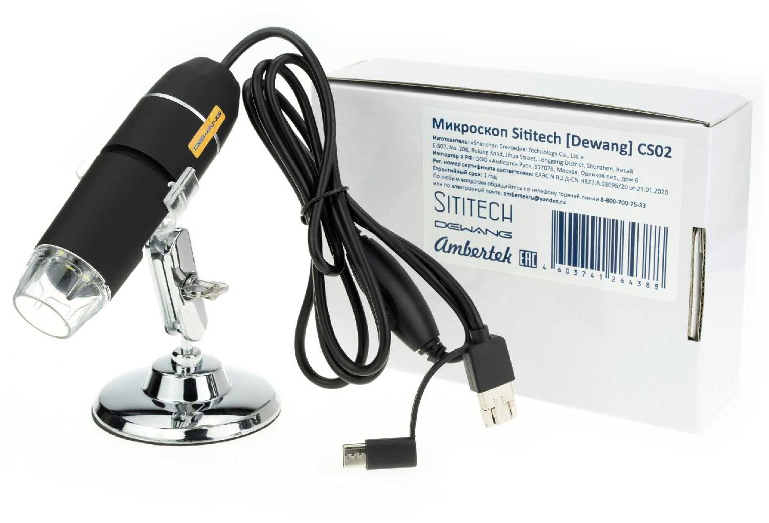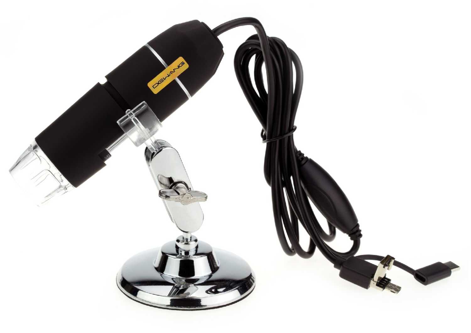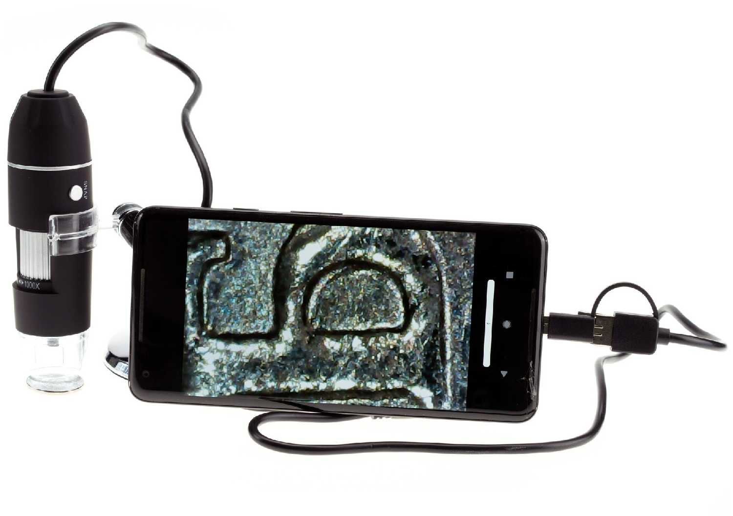 - + Невысокая цена, 1000 кратное увеличение, подключение к ПК и Android, настольный штатив в комплекте, возможность снимать видео или делать фото объектов, встроенная подсветка