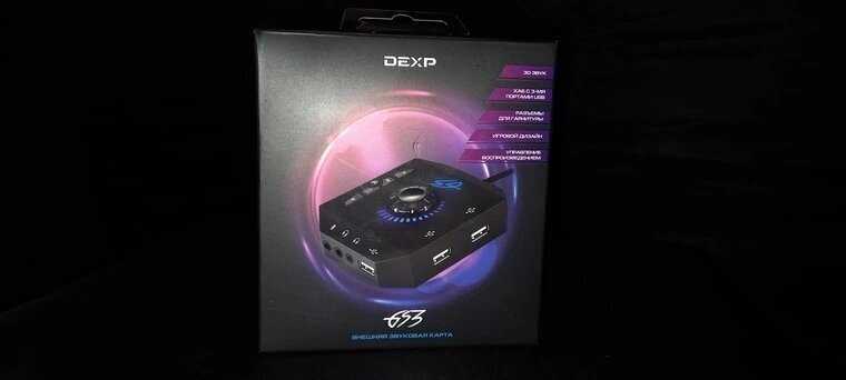 Управление звуковой картой DEXP GS3 реализовано через физические кнопки и колесо регулировки громкости. Пользователи отмечают удобство отдельных кнопок для переключения треков, паузы и отключения микрофона, однако их отзывчивость вызывает споры: в некоторых случаях кнопки срабатывают с задержкой или двойными нажатиями. Колесо громкости с синей подсветкой уровня вызывает смешанные реакции — одни хвалят визуальную индикацию, другие критикуют невозможность отключения подсветки после выключения ПК (решение — накрывать устройство тканью или вскрывать корпус для модификации). Эквалайзер с четырьмя пресетами (обычный, музыка, кино, игра) не имеет индикации активного режима, что заставляет пользователей ориентироваться на слух. Режим «игра» особенно выделяют геймеры: он улучшает позиционирование звуков в шутерах, но для тонкой настройки требуется сторонний софт, например, SSS Audio App, который добавляет виртуальный 7.1 и расширенные настройки микрофона.