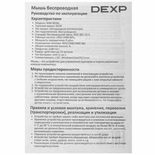 Про долговечность говорить конечно рано, но все же есть уверенность что DNS дорожит своим брендом и следит за качеством продукции. Также замечу, что не так давно у DEXP был свой собственный сайт, но сейчас его увы переделали в перенаправление на сайт DNS в раздел о бренде DEXP. Мышь к слову была куплена в ноябре 2024, а изготовлена в июне 2024. В упаковке, между картонными вкладышами, вы даже руководство по эксплуатации найдете (см. фото), из которого можете узнать для каких целей предназначена мышь :)