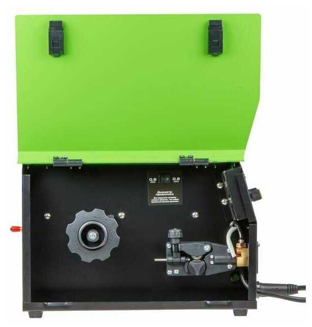 - Скорость подачи проволоки адаптируется под минимальный ток 17-19 А, что повышает удобство для любителей на даче или в гараже.