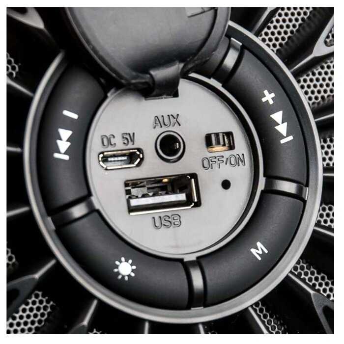 - FM-радио, USB/microSD (читает до 8 ГБ FAT32), AUX-вход, фонарик в 2 режимах, светомузыка.