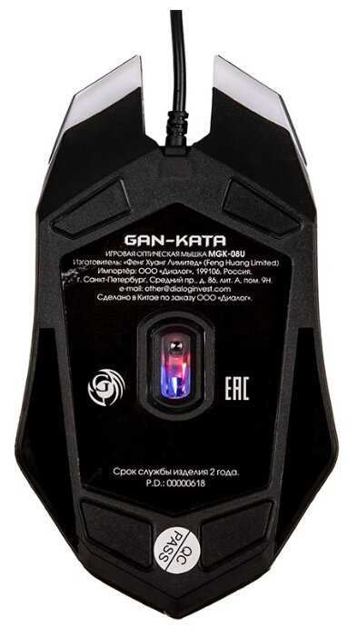 - Подсветка: подсвечивается полоса внизу по периметру мыши и лого Gan-Kata. Режим подсветки выбирается кнопокй на нижней поверхности мыши;