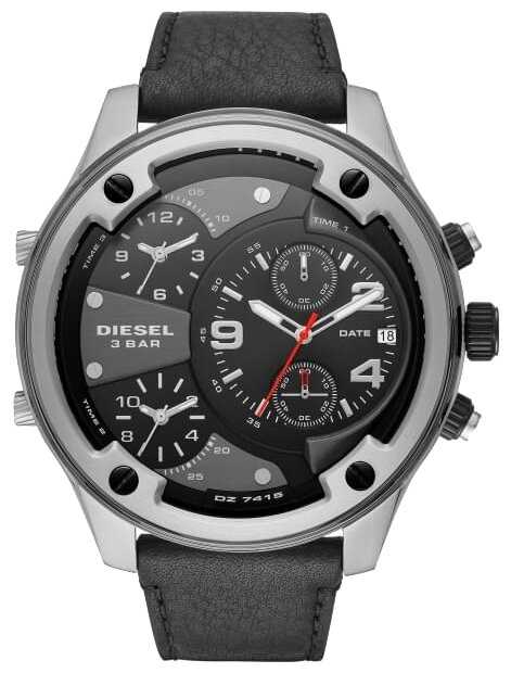 I ordered this timepiece (Diesel Boltdown Watch) for my husband. It is super rugged and fun. Out of the box it looks large. Ok, I initially described it as HUGE. But when worn, while it is definitely an eye-catcher, it is not overwhelmingly or gaudy. It has a genuine leather band (brown), with chrome accents and a black face. It was easy to set. On the face, there are three smaller clocks each with its own setting knob. One sets the main watch’s time and date, and the other sets the time in other time zones. It is not overly heavy and appears to be well made. I highly recommend it to men of all ages.