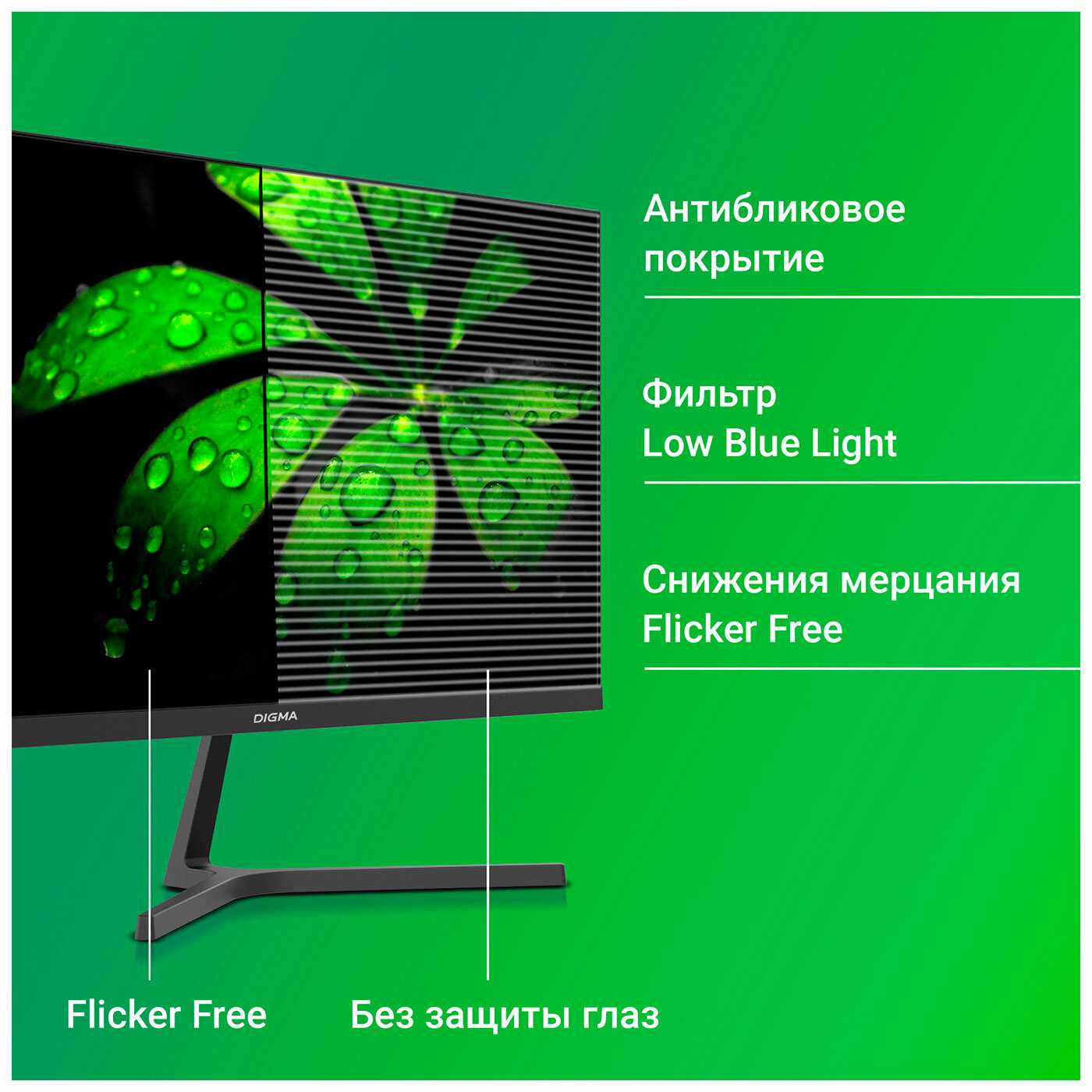 - Режим Flicker Free снижает мерцание подсветки, уменьшая нагрузку на глаза при длительных сессиях.