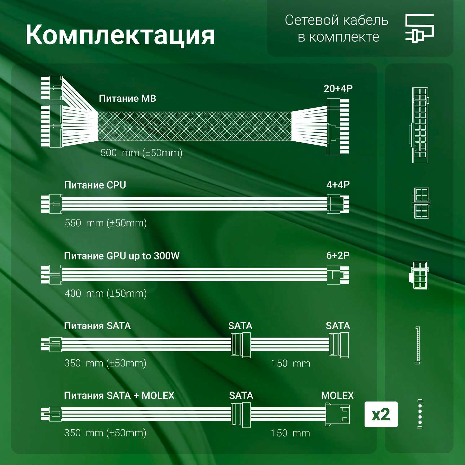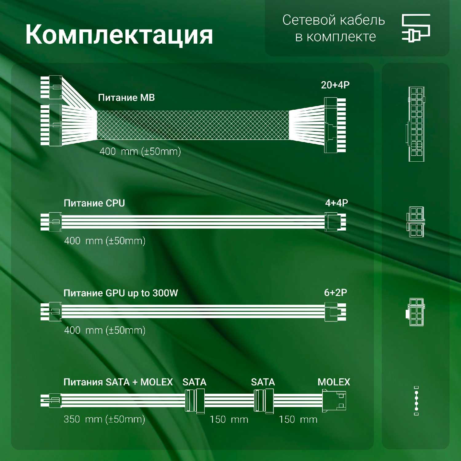 - Провода достаточной длины для корпусов Mid Tower и ATX, включая запас для аккуратной укладки.