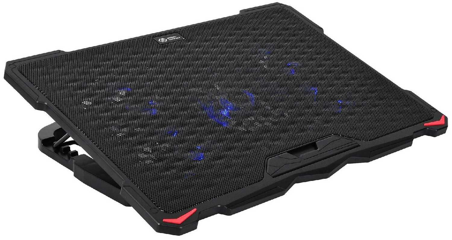 - + Ноутбук 17.3 дюйма встал на неё как родной, и даже остался запас по краям. Пять вентиляторов с разной конфигурацией. По сборке вопросов нет, пластик прочный, решётка металлическая, ничего не скрипит