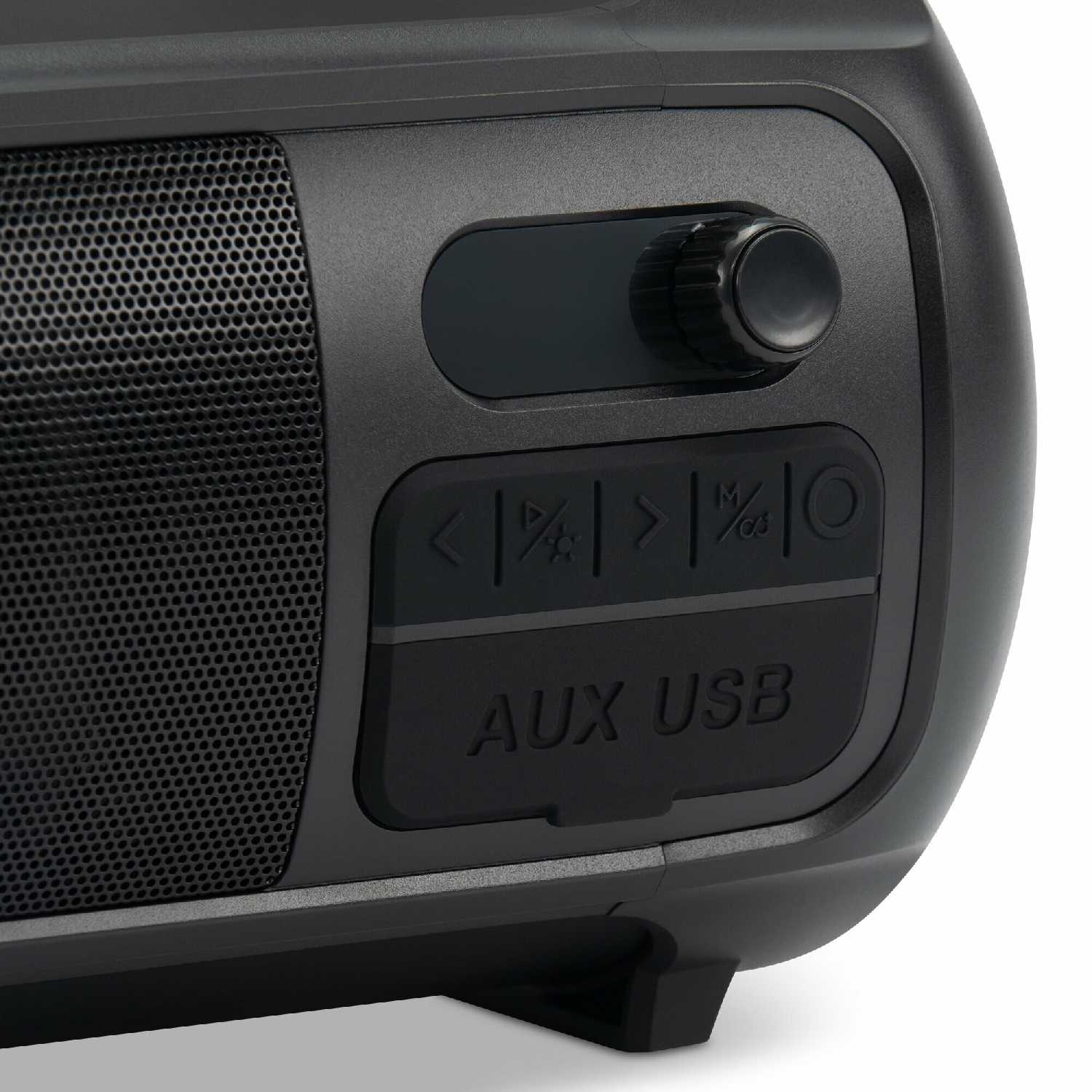 Для поиска радиостанций необходимо вставить кабель AUX в разъем (он выступает антенной), затем зажать кнопку воспроизведения. Колонка автоматически сканирует и сохраняет доступные частоты. При слабом сигнале рекомендуется поднести устройство к окну или использовать внешнюю антенну. Найденные станции переключаются кнопками «вперёд/назад». -