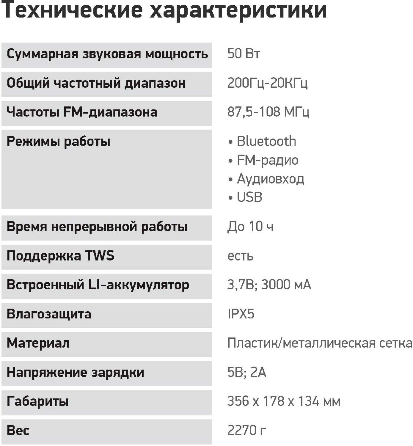 - Мощность 50 Вт обеспечивает громкое звучание, заполняющее комнату или подходящее для улицы и пикников, без заметных хрипов даже на максимальной громкости.