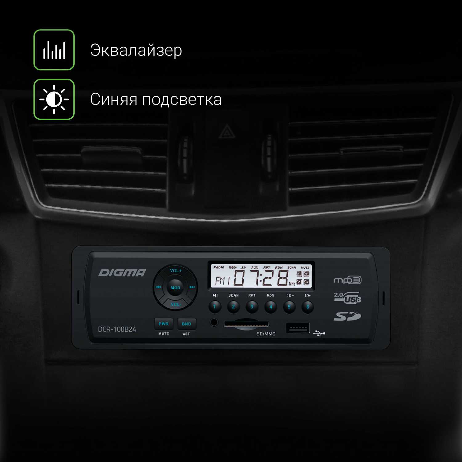 Монохромный дисплей с минималистичным дизайном не бликует и сохраняет четкость даже в солнечную погоду. Крупные цифры частот и номер трека видны с водительского места без напряжения зрения. -