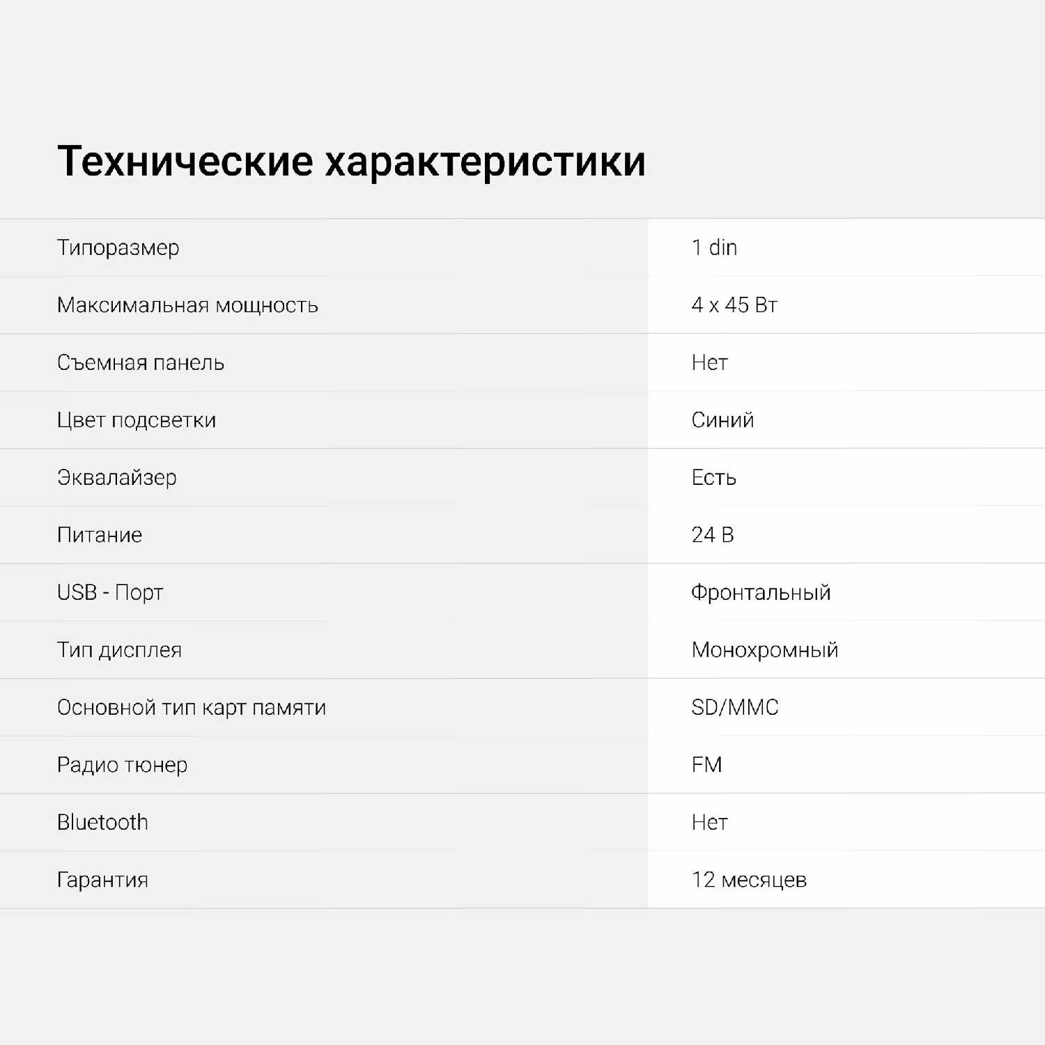 - + Нормальная магнитола для тех кто нетребователен. AUX. USB. SD. 4x45Вт. Память на 18 станций.