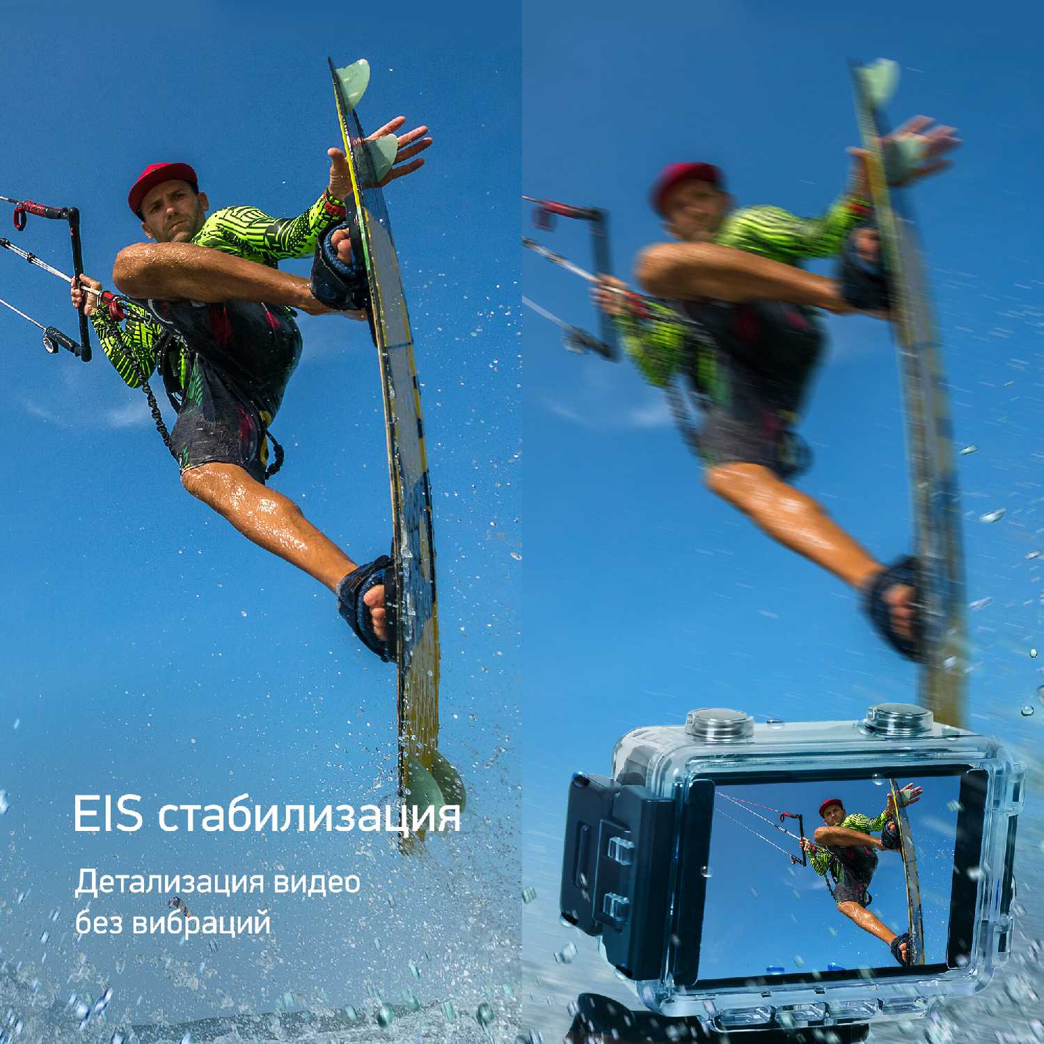 Аквабокс из комплекта обеспечивает герметичность на глубине до 30 метров — пользователи успешно снимали рафтинг и погружения. Однако пластик хрупкий: при падении на твердую поверхность возможны трещины в районе линзы. Под водой видео получается четким без размытости, но звук почти не записывается из-за изоляции микрофонов. -