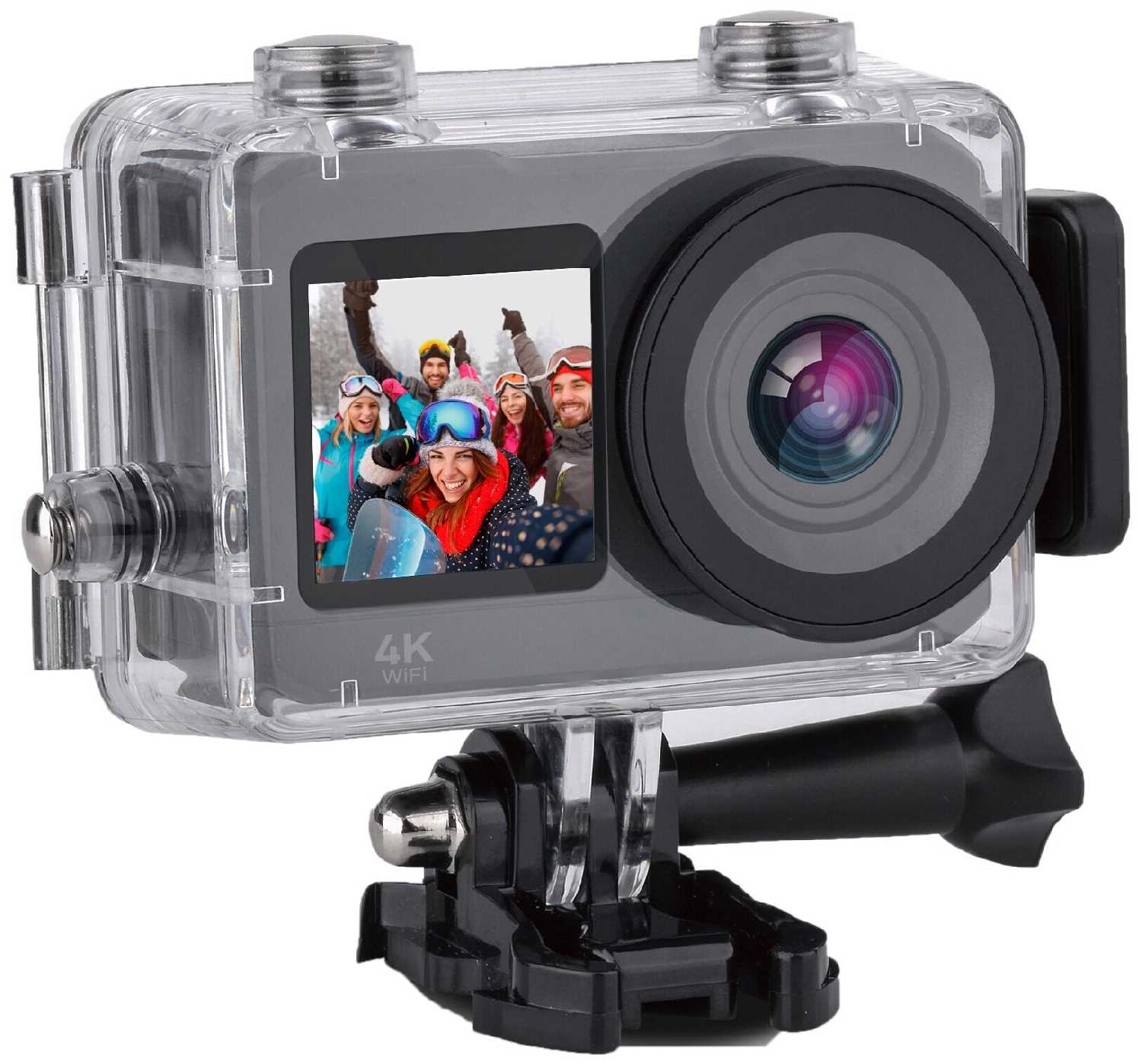 Прозрачный пластиковый корпус с прорезиненными вставками обеспечивает надёжный хват, но аквабокс часто критикуют за хрупкость: трещины после падений с малой высоты и ненадёжные защёлки. Крепления в комплекте разнообразны (на руль, шлем, плоские поверхности), но их качество неоднородно — липучки соскальзывают, а адаптеры для штатива имеют мелкие крепёжные отверстия. Водонепроницаемый кейс надёжно защищает от воды, но заглушает микрофон и искажает звук. Фронтальный экран полезен для селфи-съёмок, однако его расположение часто смещено, что визуально «резанет» изображение. Отдельно отмечают неудобное меню с управлением двумя кнопками: для смены настроек приходится пролистывать десятки пунктов.