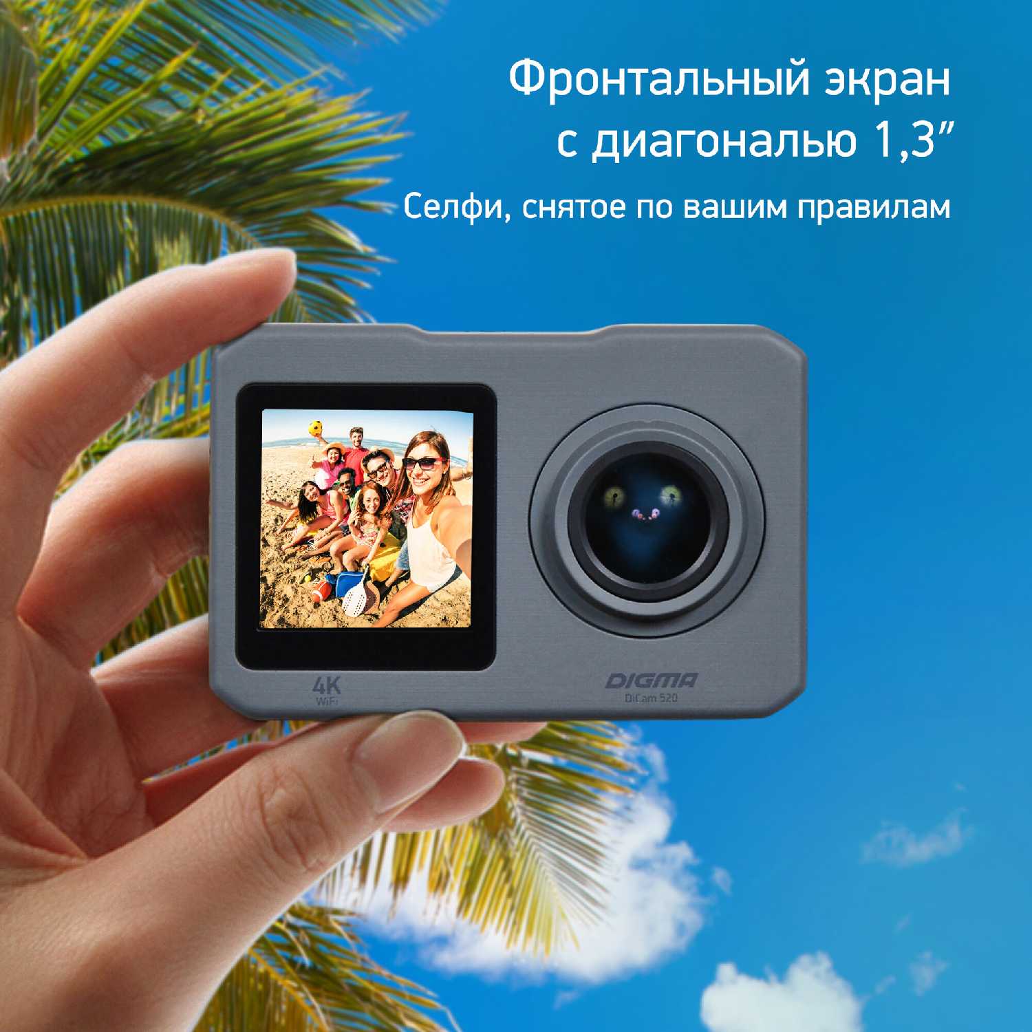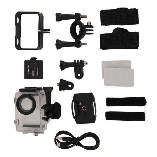 - + Большое количество всевозможных аксессуаров, которые идут в комплекте, присутствует возможность съёмки в высоком разрешении 4K, заявлено использование электронной стабилизации.