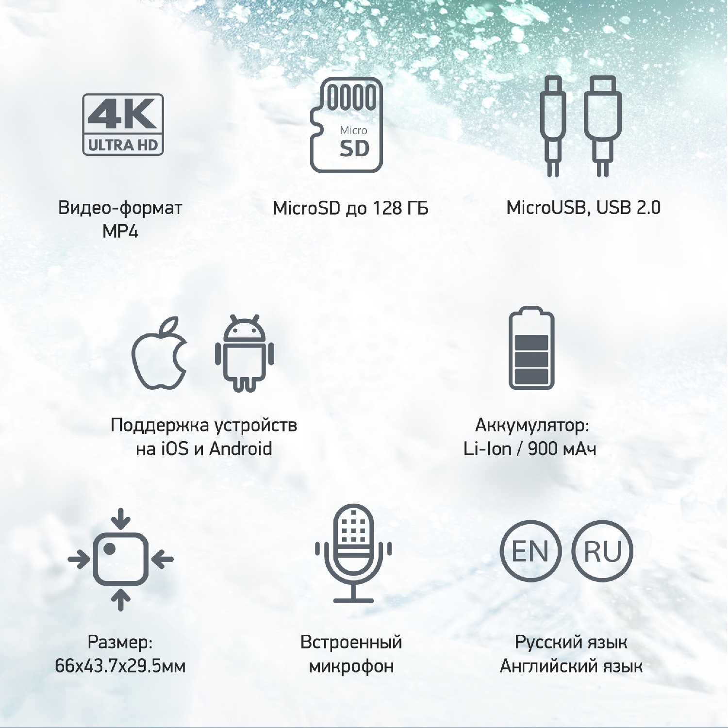 Встроенного аккумулятора емкостью 900 мАч хватает на 45–60 минут съемки в 4K или 1.5–2 часа в экономных режимах. При температуре -10°C время работы сокращается до 1 часа. Для продления сессии пользователи подключают PowerBank через micro-USB, что позволяет вести съемку без ограничений, но в аквабоксе порт недоступен. -