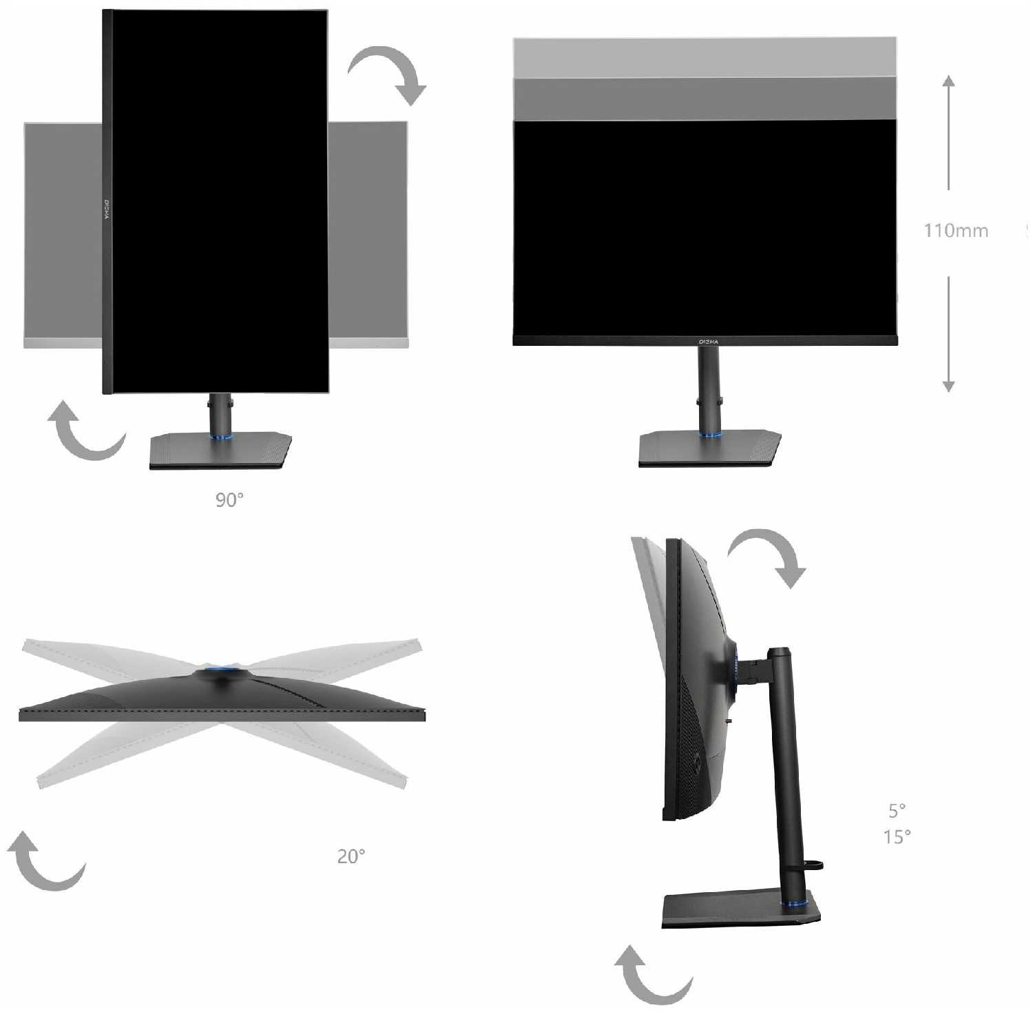 - Механизм позволяет менять высоту (диапазон 120 мм), поворот (±90°) и наклон (-5°/+20°), адаптируя экран под позу пользователя.