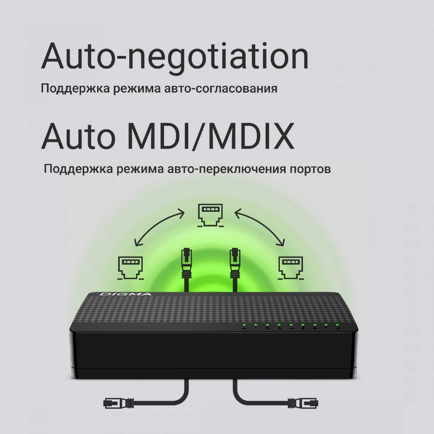 - Автосогласование (Auto-MDI/MDIX) на каждом порту позволяет использовать любые патч-корды (прямые или перекрестные) без ручной конфигурации, упрощая подключение.