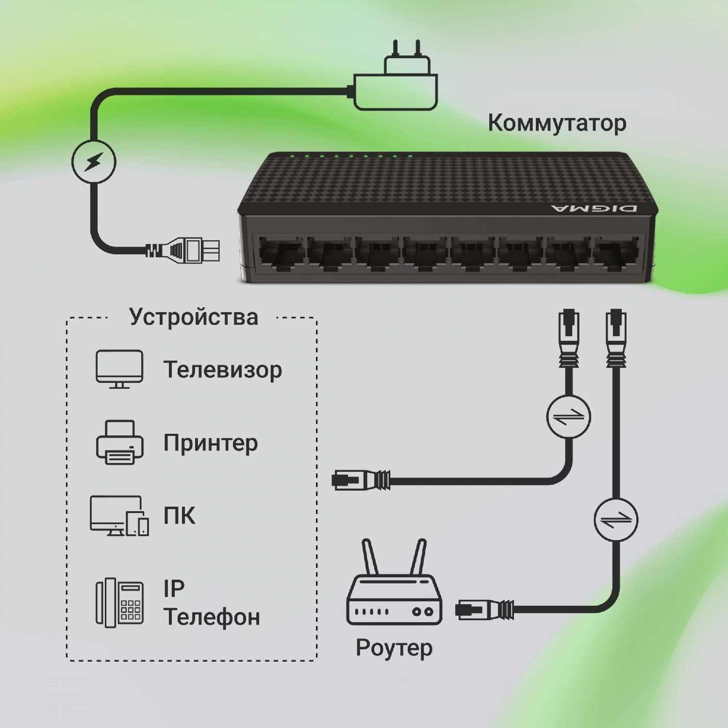 Интеграция максимально проста. Устройство не требует назначения IP-адреса или изменения настроек существующей сети. Достаточно подключить его восходящим портом (Uplink) к свободному LAN-порту основного роутера, а остальные устройства – к портам коммутатора. Сеть автоматически расширяется без потерь в скорости и функциональности.