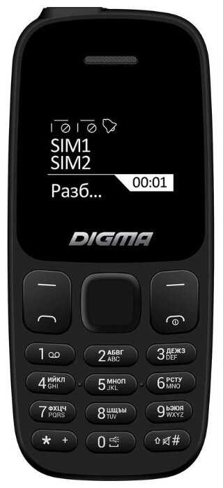 - + Чёрный сотовый телефон Digma linx A106 (модель LT1065PM) поставляется в удобной картонной коробочке 88х110х56мм с описанием основных параметров аппарата на русском языке: ч/б экран FSTN c диагональю 1.44" (96х68мм), поддержка 2 стандартных sim-карт, съёмный Li-ion АКБ ёмкостью 600mAh, поддержка сетей 2G, процессор SC6500ES, встроенная память 32Мб (свободной меньше), размер: 106х46х15м, вес: 65г (комплект =96.8г), комплектация: телефон, сетевой адаптер питания (обычная монолитная зарядка (вилка сети-провод-штекер microUSB)), руководство пользователя (русский язык есть), гарантийный талон (срок гарантии: 1 год). Цвет бывает чёрный (мой), серый и синий. Устройство обладает довольно привлекательным дизайном и кнопками, которые выглядят вполне долговечными, но главное достоинства - это цена (ею обусловлены и многие недостатки). Мобильник имеет пластиковый корпус и заднюю пластиковую крышку с защёлками на всю высоту устройства. Есть поддержка внешней MicroSD-карты объёмом до 16ГБ, яркий фонарик с 2 светодиодами в верхней части корпуса (вкл/выкл - удержание 0), 2 гнезда (microUSB и под штекер наушников) с практичным расположением в нижней части корпуса. Из приложений есть: калькулятор, таймер, секундомер, календарь +будильник, проигрыватель музыки, игра "Змейка".