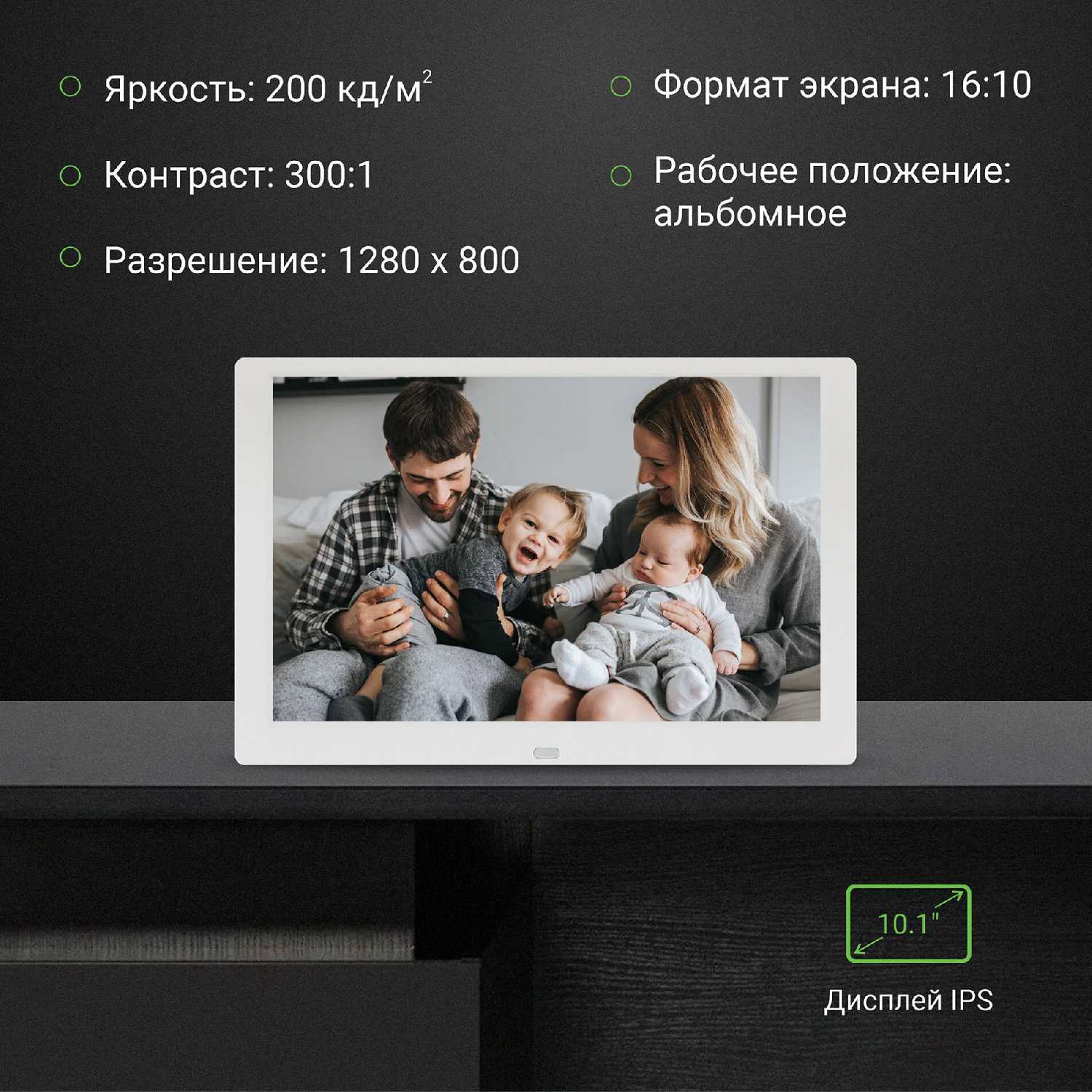 Углы обзора высокие , экран большой , можно повесить на стену . Читает карты памяти , все режимы включаются , можно регулировать громкость . Есть календарь и будильник , особых минусов нет . Экран 10.1 дюйм. Классный подарок для всех . Заменяет бумажные альбомы , работает без зависаний . Видео проигрывает , отлично . Фотографии четкие , яркие . Фотоархив доступен для просмотра каждый день . Есть пульт управления в комплекте . Хорошая цена за такую фоторамку .