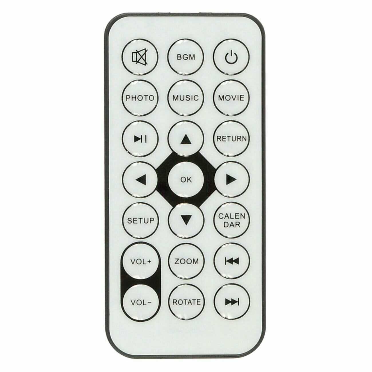 Управление осуществляется с помощью пульта ДУ, который идет в комплекте и хранится в специальном отсеке на корпусе рамки. Меню и настройки интерфейса описываются как интуитивно понятные и простые, с ними легко разобраться даже людям старшего поколения. Основные функции, такие как перелистывание фото, регулировка громкости и запуск слайд-шоу, доступны с пульта. -