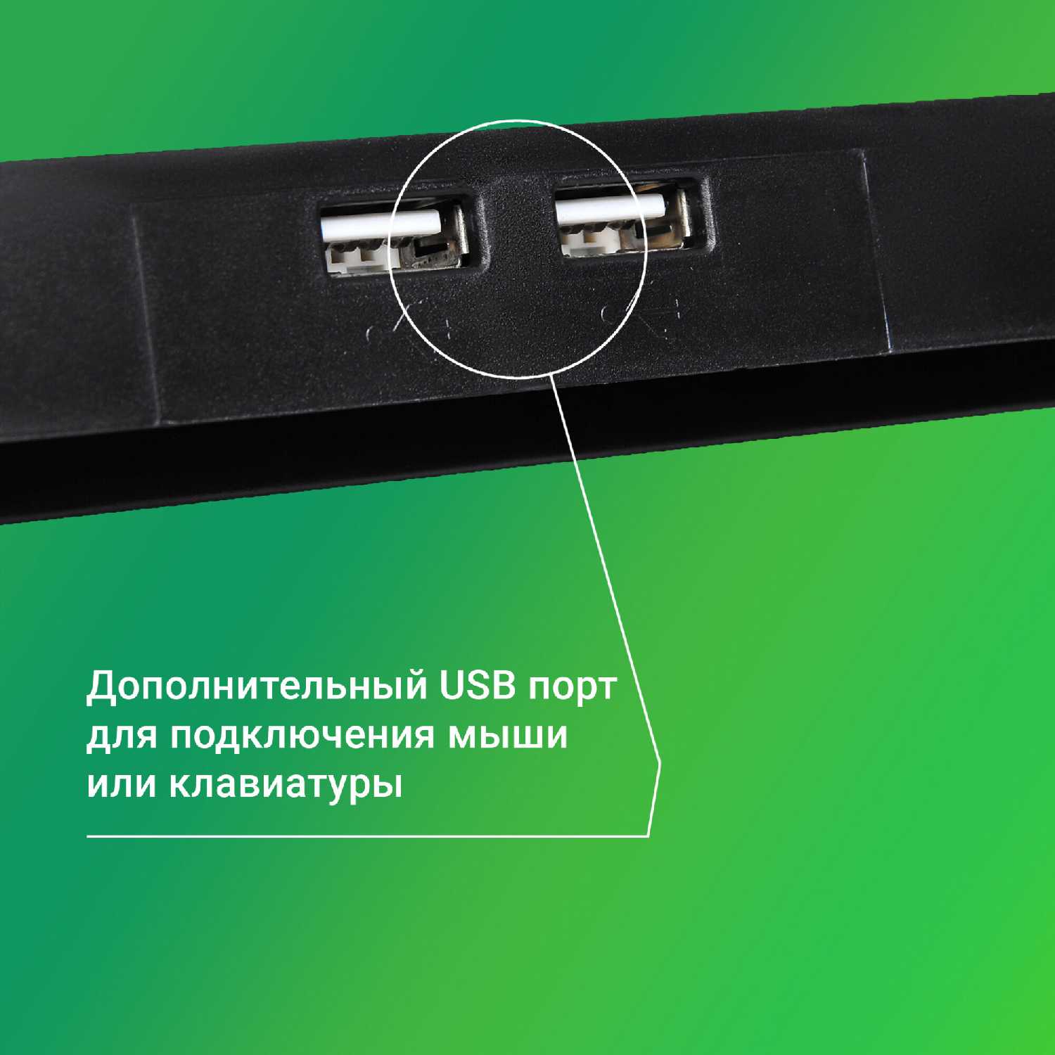 Подставка занимает один USB-порт ноутбука для питания (через кабель длиной 50-60 см), при этом предоставляет дополнительный USB 2.0 порт для периферии. Важно: при подключении энергоемких устройств (внешние HDD) возможны перебои в работе вентиляторов. Для стабильной работы рекомендуется прямое подключение к розетке через адаптер 5V/2A.