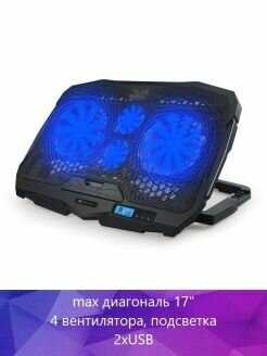Подставка на 4 вентилятора, поэтому справляется с охлаждением хорошо. Есть встроенная подсветка, вечером когда темно смотрится эфектно. Потребляет электроэнергии немного. Форма у подставки компактная и универсальная для любой диагонали до 17 дюймов. Подставка имеет небольшой наклон, ноут на ней стоит уверенно и не скользит во время работы. Зато работать ему легче, потому что про перегрев можно забыть. Модель с регулировкой скорости и портами USB для подключения мыши например.