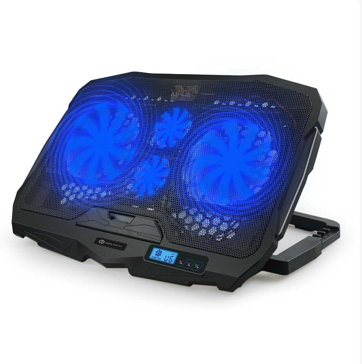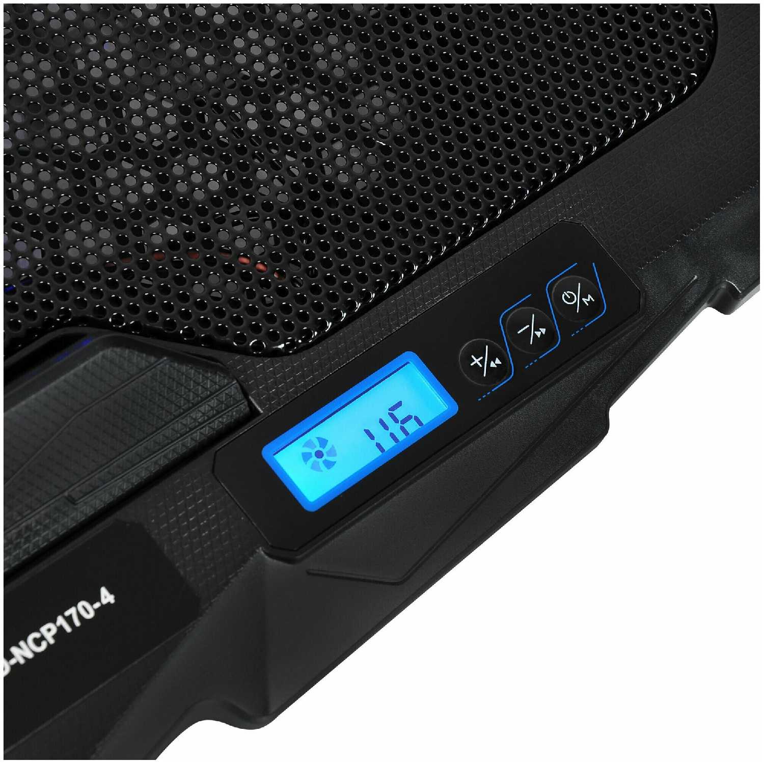 Четыре вентилятора (два крупных диаметром ~70 мм и два малых) работают от USB 2.0 с максимальным потреблением 5V/1A. Шесть скоростных режимов практически не отличаются по интенсивности воздушного потока, что сводит их полезность к минимуму — пользователи используют только максимум. Уникальная функция — отключение пар вентиляторов кнопкой «M» (большие/малые), но она не афишируется в инструкции. ЖК-дисплей отображает текущую скорость, а синяя подсветка декоративна, но практически не видна за ноутбуком. Критичный недостаток — питание через USB без отдельного разъёма: при использовании удлинителей сбиваются настройки режимов, а для стабильной работы требуется прямое подключение к адаптеру. Управление кнопками ненадёжно: часть клавиш не реагирует на нажатия или требует чрезмерного усилия.