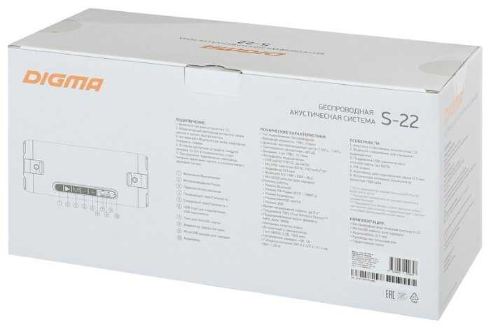 Портативная колонка DIGMA S-22 Black имеет чистый звук без хрипов. Играет громко. Качество исполнения и дизайн на высоте. Радио ловит без помех, есть блютуз и поддержка флеш. Сопрягается с такой же колонкой. Связь не теряет. Сначала купил одну ,потом решил докупить для сопряжения. Заряд держит долго .