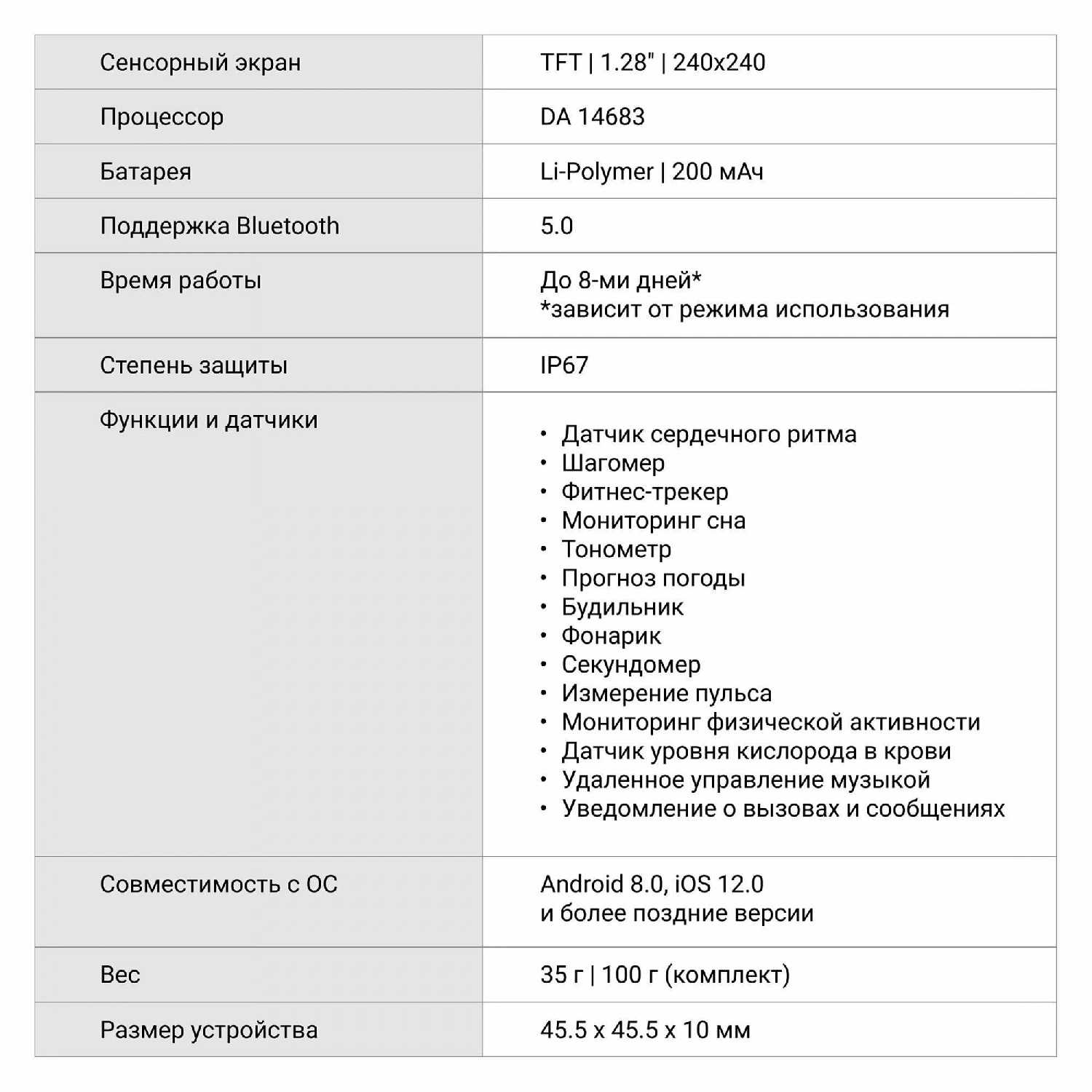 Мониторинг : | калорий, сна, уровня кислорода в крови, физической активности |