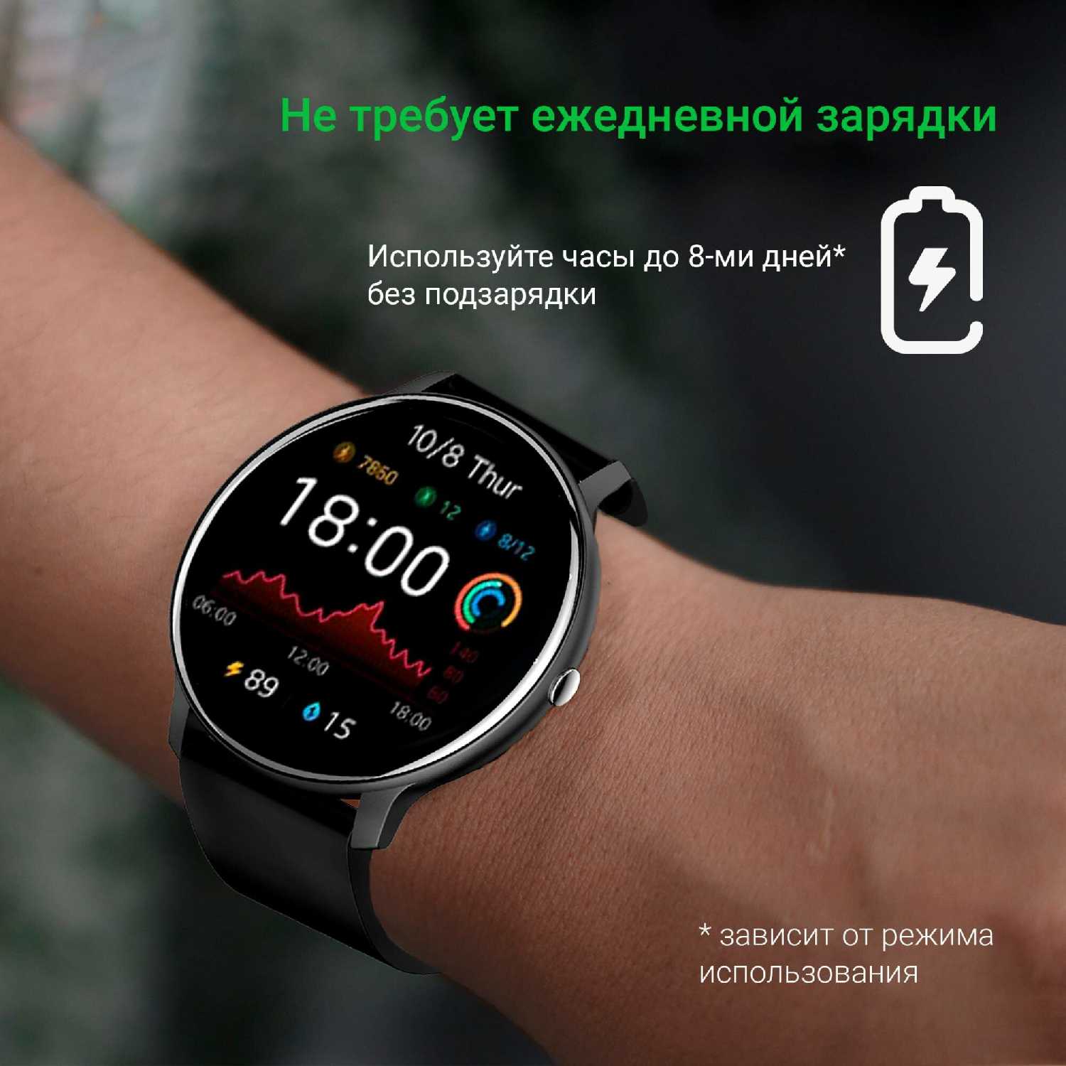 При включенных уведомлениях, шагомере и периодических замерах здоровья часы работают 3-4 дня без подзарядки. В экономном режиме (только время + редкие замеры) автономность достигает 10-15 суток. Полная зарядка через USB-кабель занимает около 150 минут, при этом индикация процесса на экране минимальна — уровень отображается лишь мелкими значками на некоторых циферблатах. -