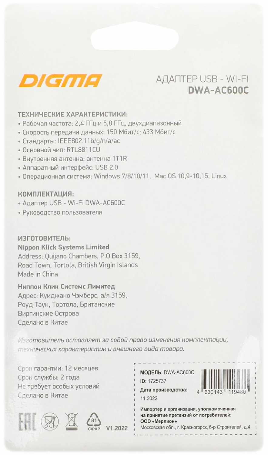 Характеристи Digma USB 2.0 [dwa-ac600c]