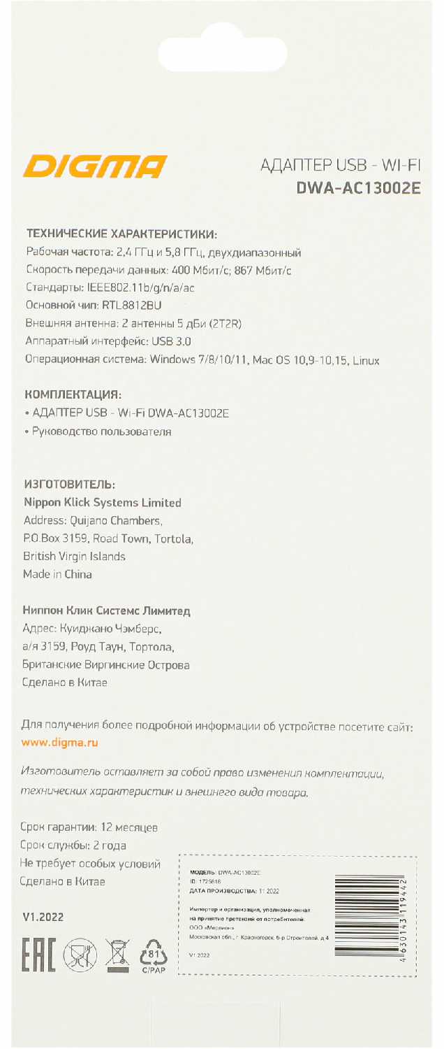 Отзывы о Сетевой адаптер Digma WiFi Digma (dwa-ac13002e)