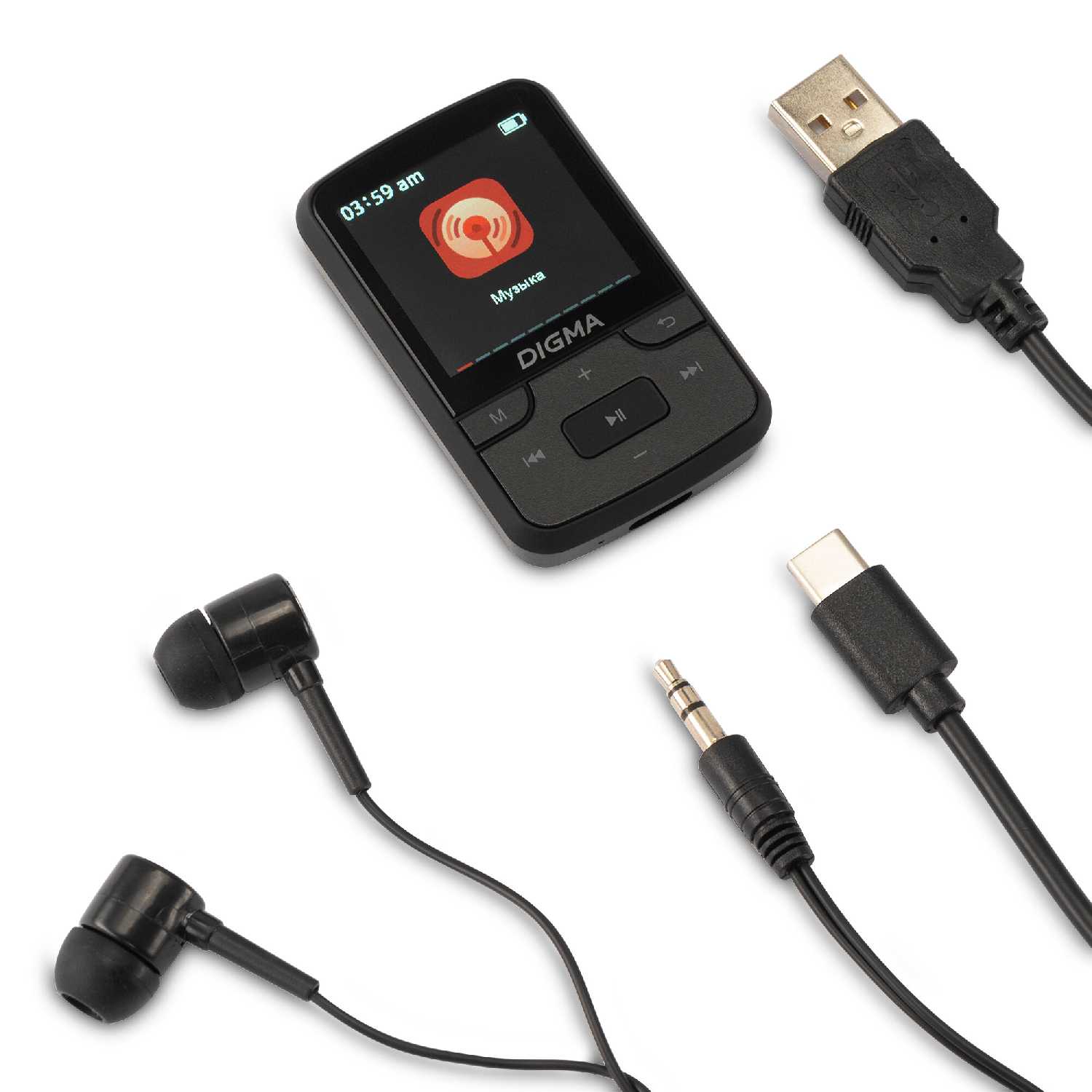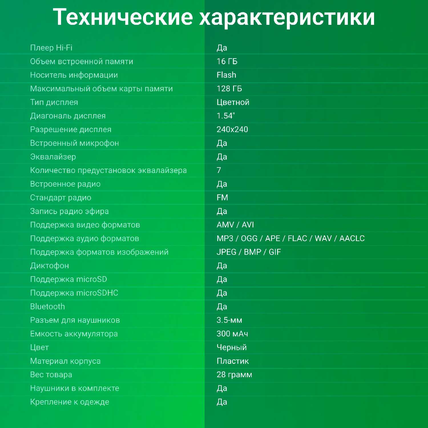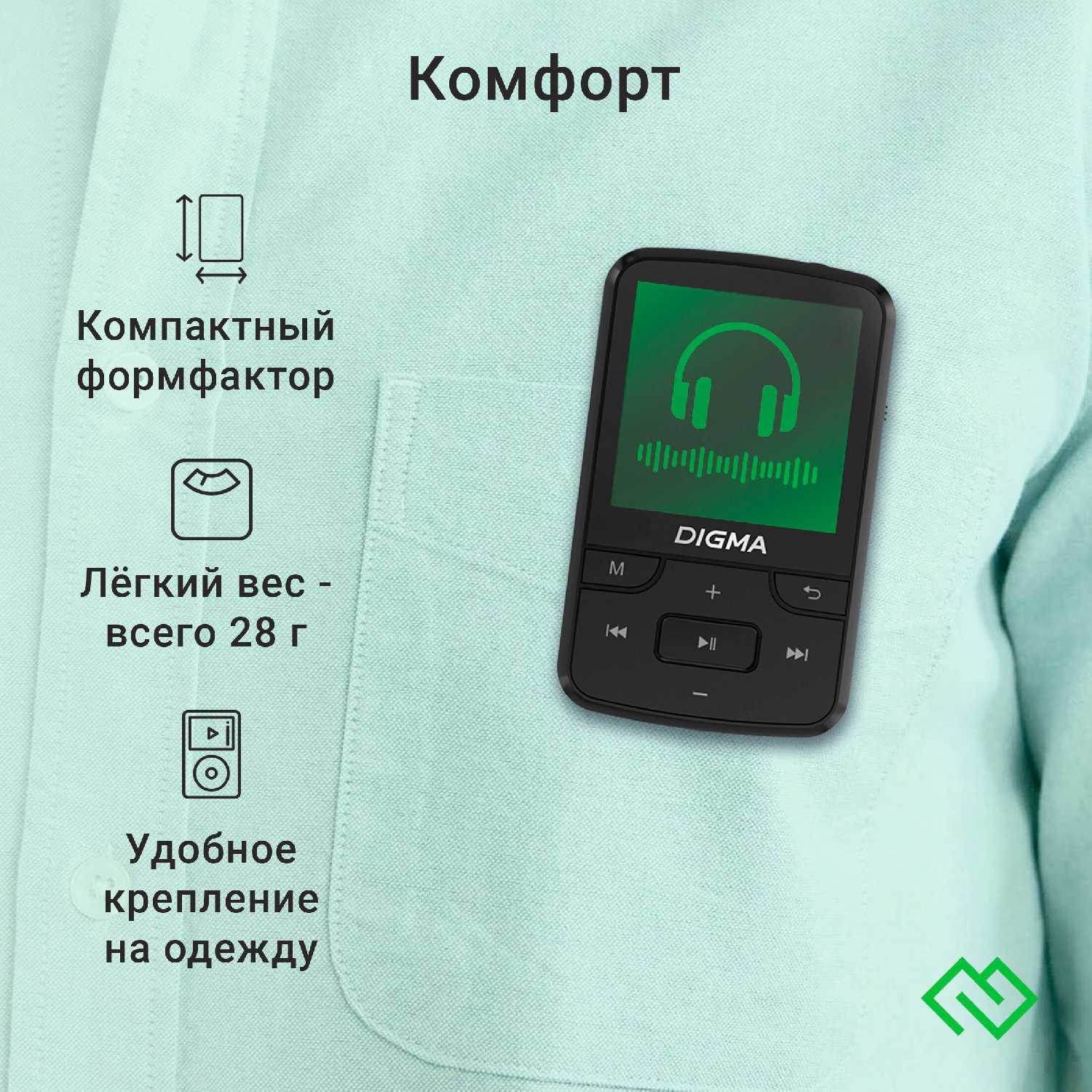 - Габариты 6×4 см и вес 28 г позволяют незаметно носить плеер на одежде или в кармане.