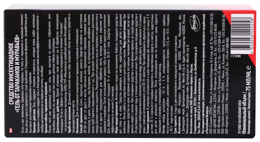 Гель от тараканов и муравьёв пришёл в целой, неповрежденной упаковке, срок годности в норме. Тюбика думаю хватит использовать на несколько раз так как объём приличный. Обработали гелем кухню, Стасики дохнут и их становится со временем всё меньше, надеюсь что их не будет совсем. К покупке рекомендую!!!