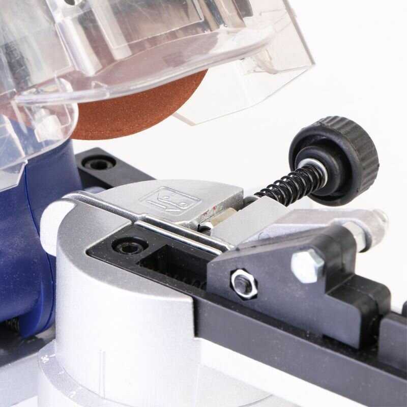 При заточке левой стороны цепи, во время фиксации, цепь смещается в лево за упорную планку. Планка имеет срез слевой стороны. Пришлось просто давать натяжку цепи рукой. На качество заточки не повлияло.