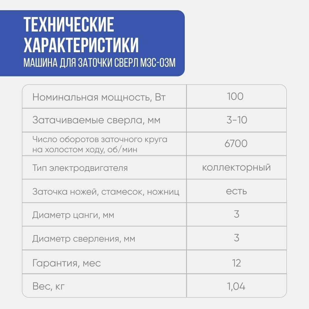 Дополнительная информация : | диапазон затачиваемых свёрл - от 3 до 10 мм, тип электродвигателя: коллекторный, масса не более 104 кг, габаритные размеры не более 140x160x110 мм, класс защиты машины – II (с двойной изоляцией), рРежим работы машины повторно-кратковременный - S2-30 мин |