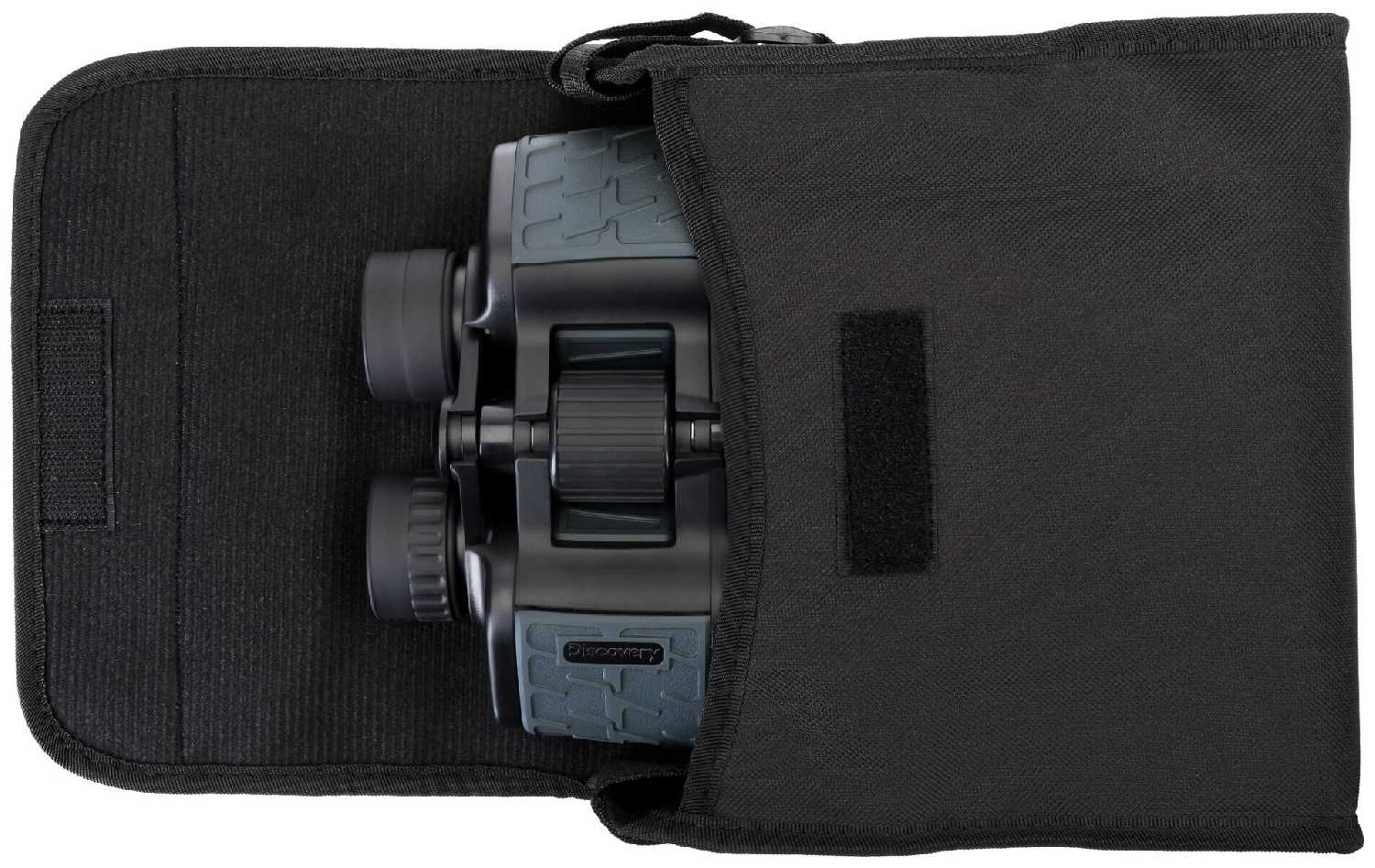 В комплект входит простенькая сумка с ремнем, бинокль в нее помещается туго, но вместе со своим ремнем и защитными колпачками на линзах. Сумка максимально простая, с ремешком через плечо. Закрывается на простенькую маленькую липучку, не герметично и не "надежно", но бинокль не выпадет, т.к. "сидит" в сумке плотно :)