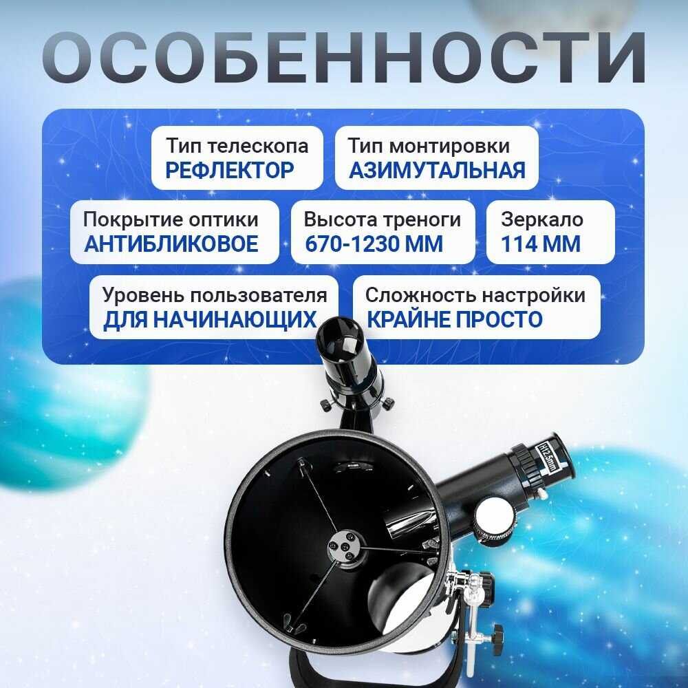 - - Монтировка (тренога) предельно простая, без возможностей точной настройки - навестись на что-то удаленное в дальнем космосе при большом увеличении нереально.