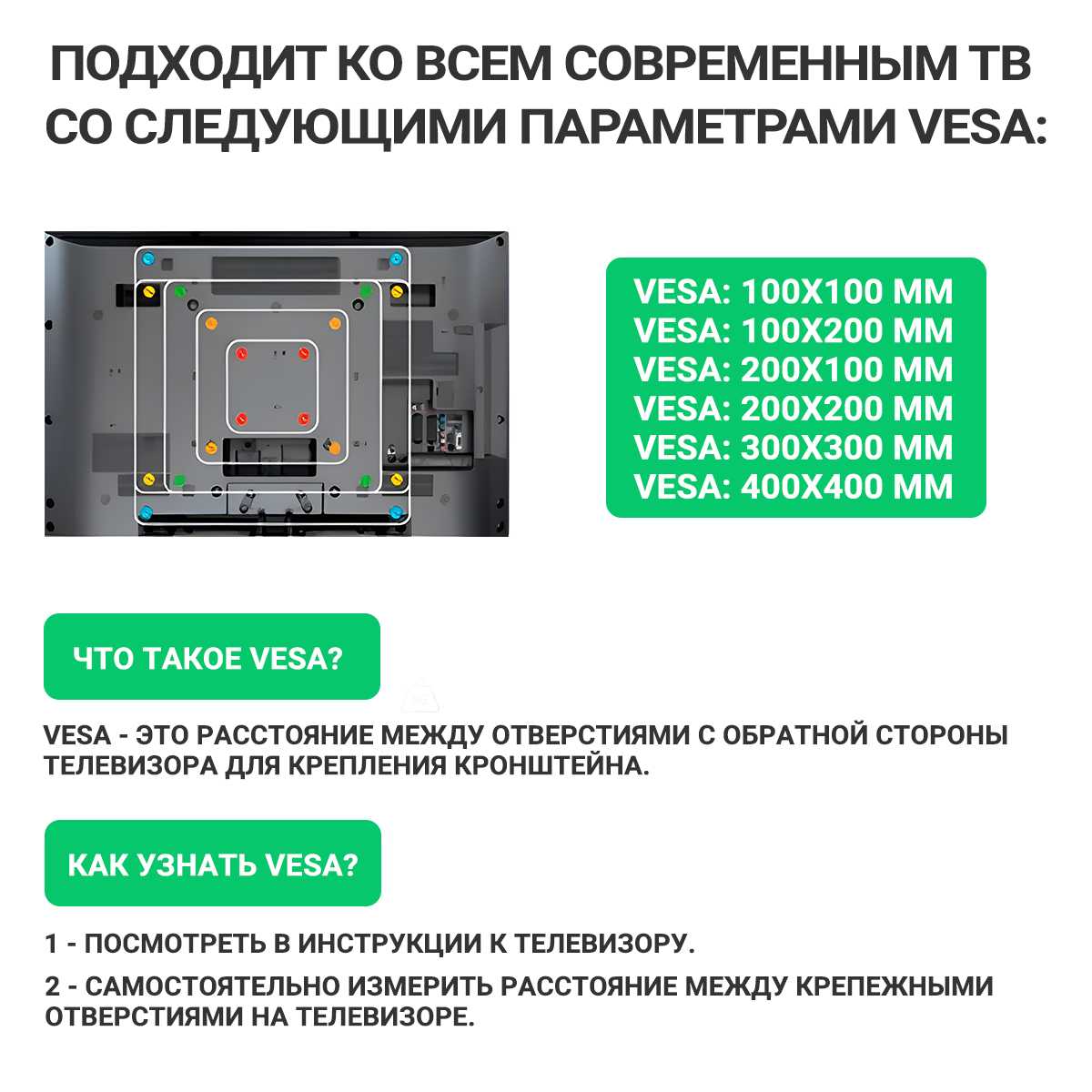 Стандарт Vesa : | 100x100 мм, 100x200 мм, 200x100 мм, 200x200 мм, 200x300 мм, 200x400 мм, 300x100 мм, 300x200 мм, 300x300 мм, 300x400 мм, 400x100 мм, 400x200 мм, 400x300 мм, 400x400 мм |