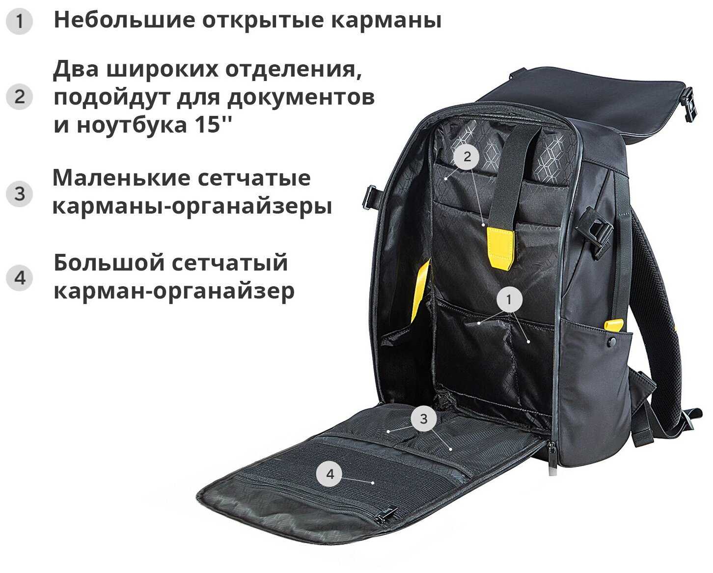 - - не самые удобные карманы внутри. первый карман сверху скорее всего будете использовать под паурбенк, так как туда выходит кабель. при этом кабель более некуда не вывести без повреждения рюкзака. поэтому этот карман будет успешно занят только паурбенк - другое с трудом поместится. при этом паурбенка в комплекте нет, используйте свой