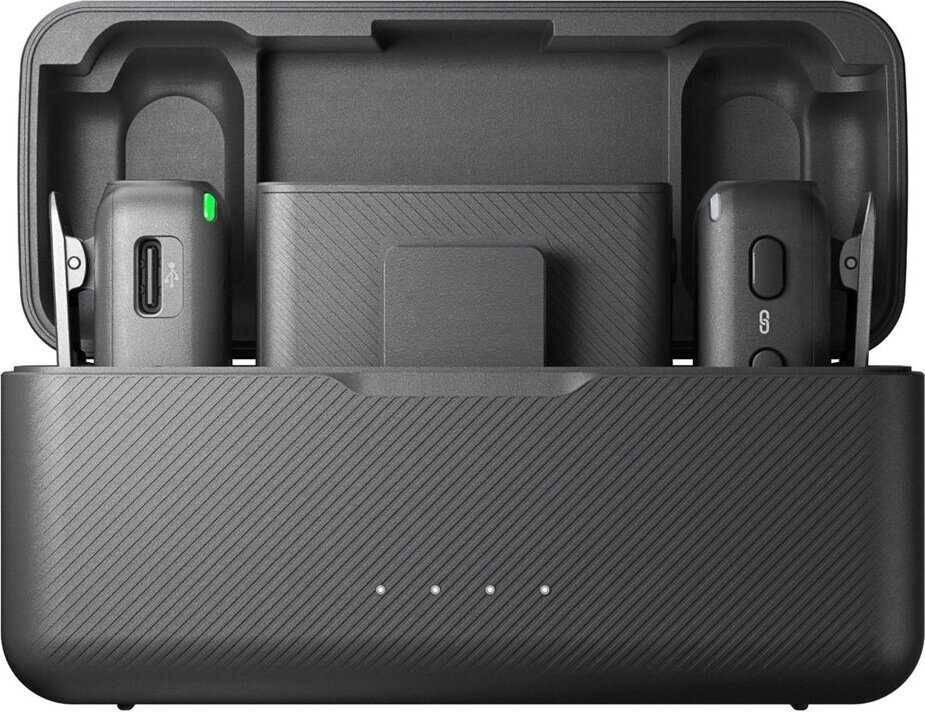 Зарядный кейс не только хранит, но и многократно подзаряжает передатчики и ресивер, существенно увеличивая общее время работы комплекта. Одного полного заряда кейса и устройств хватает на несколько часов интенсивной съемки, что подтверждается опытом пользователей. Сам кейс заряжается через порт Type-C. Такое решение избавляет от необходимости постоянно следить за уровнем заряда каждого устройства в отдельности и идеально подходит для мобильной работы. -