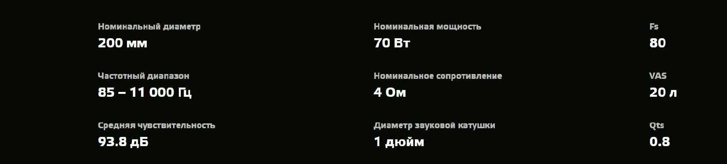 | Резонансная частота НЧ-динамика (Fs) : | 80 Гц |
