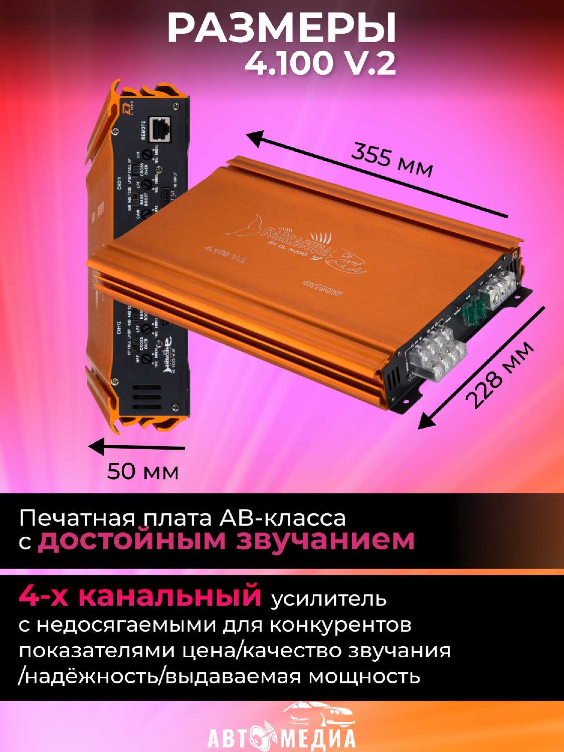 - Выходная мощность на канал (4 Ом): 100 Вт
