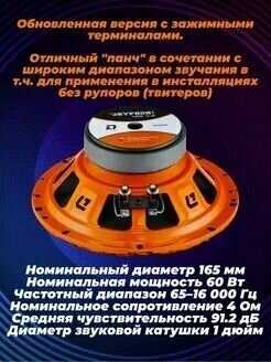 Динамики оснащены пружинными клеммами (push-терминалами), которые упрощают подключение проводов. Магнитная система крупнее стандартной, что требует проверки глубины монтажного места. Стандартный размер 16 см (6.5") подходит для большинстве передних дверей, но не универсален для задних. -