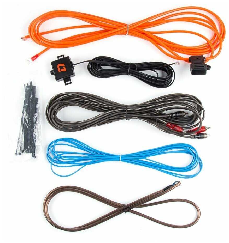 - В набор входят силовые провода с предохранителем, RCA-кабель, remote-провод и выносной регулятор баса, что устраняет необходимость докупать компоненты.