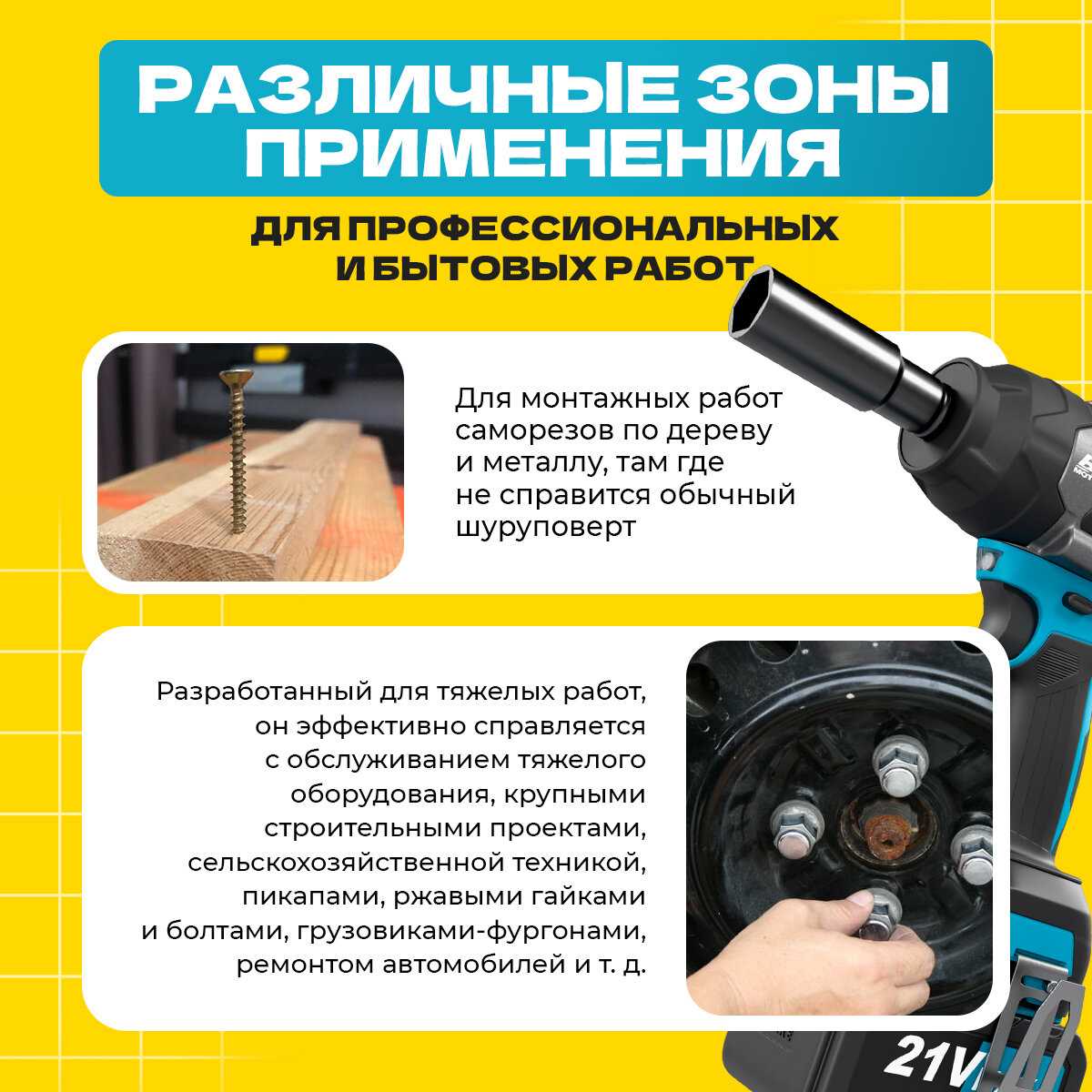 Идеален для дома, дачи, гаража: сборка мебели, ремонт авто, смена колес, откручивание заржавевших гаек. Подходит новичкам и женщинам — справляются без опыта. Не для профессионального использования с тяжелым крепежом или в мороз.