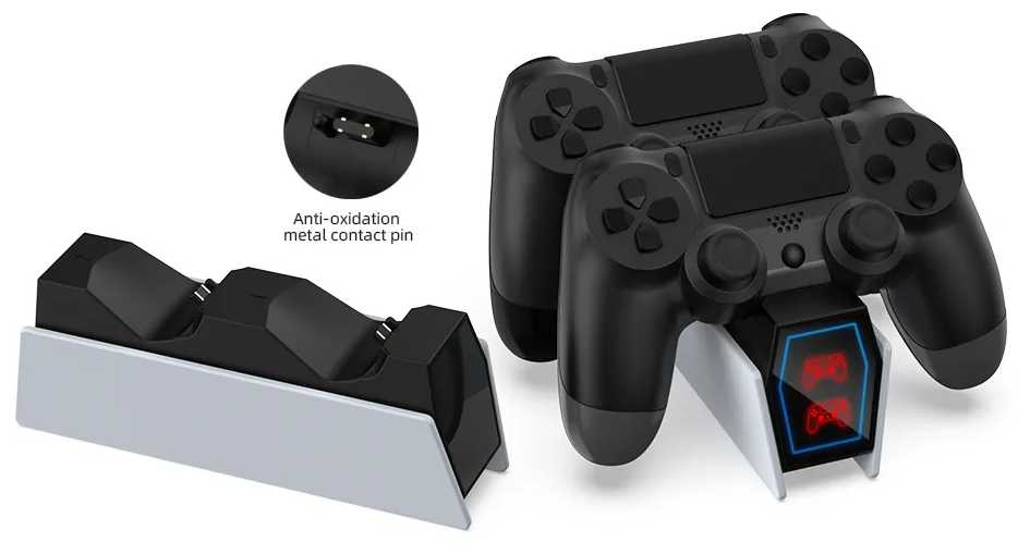 - Двухцветные LED-индикаторы (красный/синий) отображают статус зарядки для каждого геймпада отдельно.