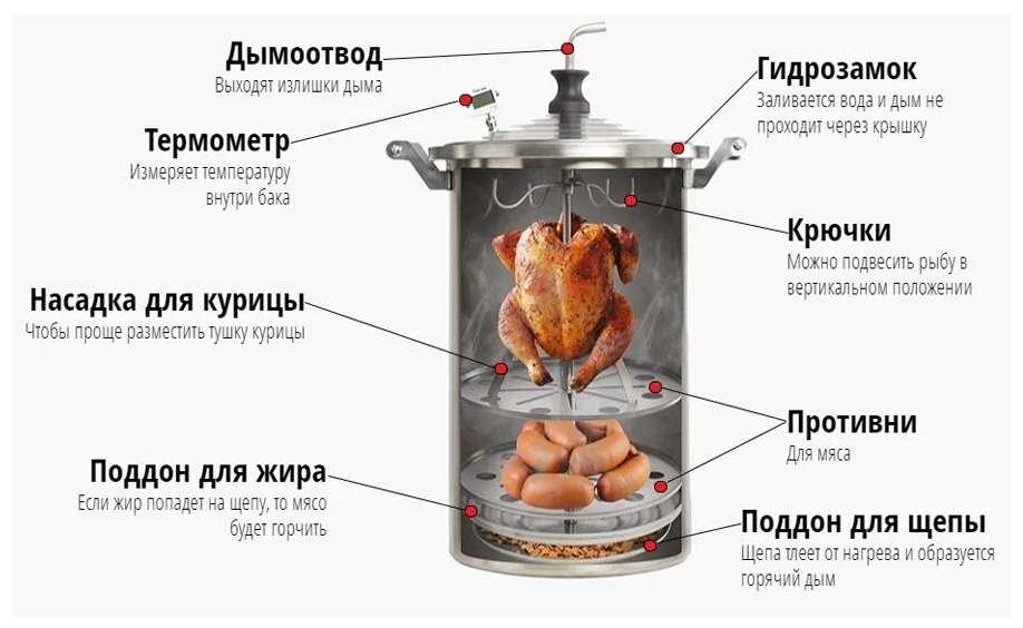 Дополнительная информация : | Комплектация: Бак с крышкой 1 шт, Электронный термометр 1 шт, Ручка для извлечения набора 1 шт, Крючки для подвешивания 1 шт, Насадка для курицы 1 шт, Противень для мяса 1 шт, Поддон для жира 1 шт, Поддон для щепы 1 шт, Книга рецептов 1 шт, Инструкция 1 шт, Шпагат 5 м, Шланг 4 м, Щепа для копчения 200 г |