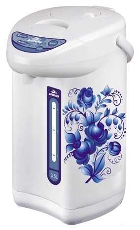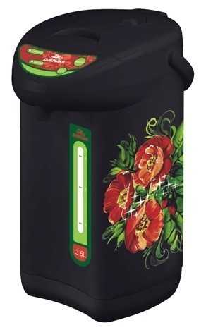 Успела заказать термопот за 2990 р. Дизайн очень красивый, под хохломскую роспись. Для моей семьи из 3 человек объем очень даже достаточный. Понравилось то, что есть все виды подачи воды. Так же есть ручка, для переноски - это очень удобно. Из недостатков то, что пришел с вмятинами на корпусе. Брала для себя, поэтому посчитала, что это не критично, так как поверхность глянцевая, переливается и отсвечивает, вмятины не сильно заметны. Запах пластика был в 1 день, но не резкий, быстро исчез.Товар рекомендую.