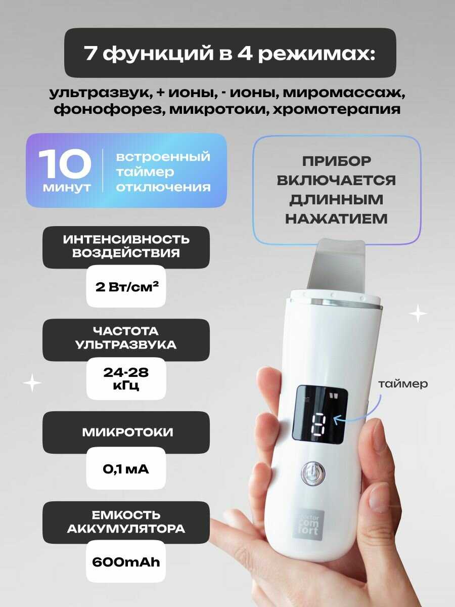 Очень удобно проводить чистку дома, раз в неделю посветить время себе. После чистки наношу сыворотку с активным веществом (витамины или ниацинамид, или кислоты), и с помощью этого же аппарата прохожу по лицу на режиме массажа. Кожа сияет, напитана! Удобно что при включении у аппарата высвечивается таймер на пять минут. Сразу можно рассчитать время массажа разных участков.